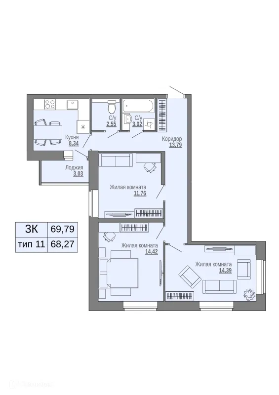 3 комн. квартира в Архангельске в ипотеку от 65 576 руб/месяц